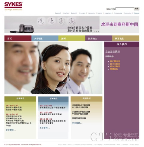 CTI論壇(ctiforum)8月8日消息(記者 潘婷婷): 為了更全方位地展現(xiàn)賽科斯中國的公司風貌,公司網(wǎng)站(www.sykes.com.cn)經(jīng)改版后于8月4日全新登場。新網(wǎng)站在風格、結(jié)構(gòu)、內(nèi)容等方面作了整體改進,使得整個網(wǎng)站的表現(xiàn)更清晰,界面更友好。