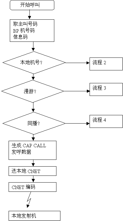 異地呼叫漫游到本地的異地機(jī)時(shí),異地發(fā)出的CAP CALL會(huì)送入本地發(fā)呼工作站,發(fā)呼工作站僅修改其目的地址,把它轉(zhuǎn)發(fā)給本地CNET由CNET送到編碼器編碼后送到發(fā)射機(jī)發(fā)射,完成呼叫過(guò)程。詳見(jiàn)流程5。