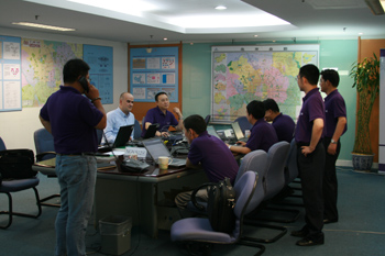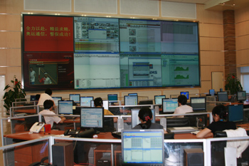 上海貝爾阿爾卡特工程師在公司設(shè)立在北京的奧運(yùn)保障指揮部緊張工作