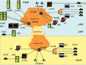 杭州秋濤局配置的是A7505中繼網(wǎng)關(guān)、A1540接入網(wǎng)關(guān)以及其他的綜合接入設(shè)備、SIP終端、H.323終端等。A7505同當(dāng)?shù)亟粨Q機配合可以經(jīng)由IP骨干網(wǎng)實現(xiàn)上海到杭州的長途語音業(yè)務(wù)。A1540及經(jīng)由它的ST700可以實現(xiàn)NGN的語音數(shù)據(jù)業(yè)務(wù)。杭州到上海的連接是通過中國電信的IP骨干網(wǎng)實現(xiàn)的。