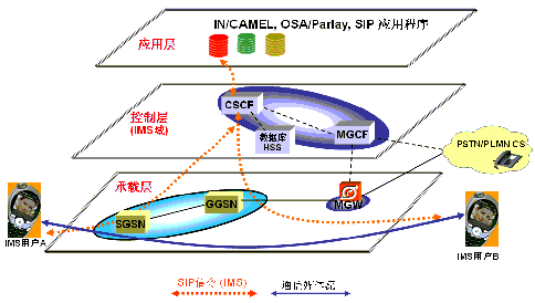 VPN等。圖中以移動(dòng)分組網(wǎng)的承載方式為例,描述了IMS用戶通過手機(jī)進(jìn)行IMS會(huì)話的方式,主要的承載層設(shè)備有SGSN、GGSN,以及媒體網(wǎng)關(guān)MGW。SGSN和GGSN可以完全重用現(xiàn)網(wǎng)設(shè)備,不需要硬件升級(jí),僅通過做相關(guān)配置就可以支持IMS了。MGW是負(fù)責(zé)媒體流在IMS域和CS域互通的功能實(shí)體,主要解決話音互通問題。無論具體采用哪一種接入方式,只要基于IP技術(shù),所有的IMS用戶信令就可以很好地傳送到控制層。