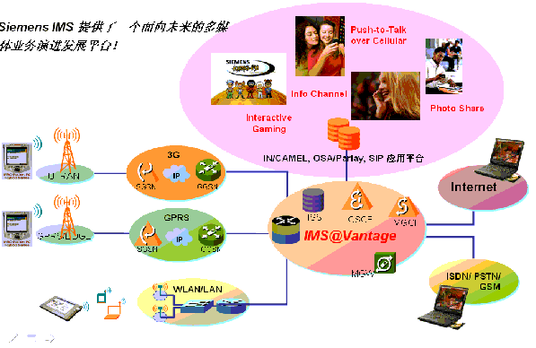 西門子IP多媒體子系統(tǒng)名為IMS@vantage,它完全遵循3GPP規(guī)范,提供了一個(gè)支持語音/多媒體數(shù)據(jù)業(yè)務(wù)集成的開放式網(wǎng)絡(luò)控制平臺(tái),能為運(yùn)營商以最經(jīng)濟(jì)快捷的方式提供多媒體應(yīng)用及開發(fā)環(huán)境。