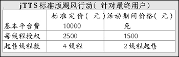 jTTS標(biāo)準(zhǔn)版在聲音質(zhì)量、聲音平滑度、自然度等方面已具有比較高的實(shí)用化水平。為了真正啟動語音技術(shù)的應(yīng)用市場,捷通華聲啟動“颶風(fēng)行動”,在活動期間為最終客戶、系統(tǒng)集成商制定了一個極具競爭力的價(jià)格,并且無平臺費(fèi)。這次活動主要針對CTI領(lǐng)域中大量中小型系統(tǒng)的應(yīng)用開展此次活動,目的是讓先進(jìn)的技術(shù)能夠被更多的用戶采用,為系統(tǒng)集成商應(yīng)用TTS技術(shù)提供了很高的利潤空間。