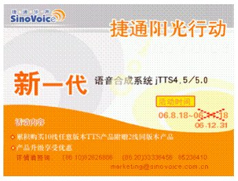 2006年8月18日,捷通華聲正式發(fā)布新一代語音合成系統(tǒng)jTTS4.5,同時啟動了為期三個月的“陽光行動”。行動一經(jīng)推出,立即引起了強(qiáng)烈的市場反響。每日致電(86-10)82826886咨詢jTTS4.5產(chǎn)品及價格詳情的客戶接連不斷,通過訪問捷通華聲語音合成在線演示系統(tǒng)http://www.sinovoice.com.cn/2-e-1.asp或者撥打24小時產(chǎn)品演示熱線(86-10)82826886-8624體驗合成效果自然度和流暢度的用戶絡(luò)繹不絕,定購產(chǎn)品享受累積購買10線任意版本TTS附贈2線同版本產(chǎn)品等優(yōu)惠政策的合作伙伴更是紛至沓來。大家都對jTTS4.5的新增甜美音色大加贊賞,更對jTTS4.5合成效果自然度和流暢度的提升給予了極大的肯定及滿意,同時表達(dá)出希望能延長活動時間的誠懇建議。為答謝新老客戶對捷通產(chǎn)品的關(guān)注與厚愛,捷通公司特決定將“陽光行動”活動時間延期至12月31日。