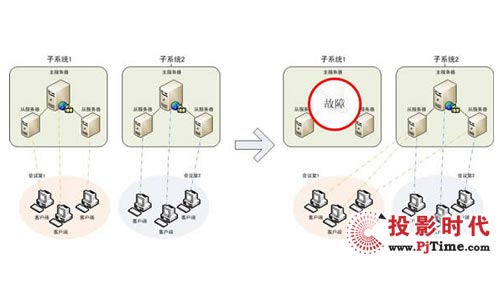 當(dāng)一個子系統(tǒng)出現(xiàn)故障時(shí),系統(tǒng)可以自動將故障子系統(tǒng)上的會議遷移到其他子系統(tǒng)上,做到子系統(tǒng)互為備份,極大提高了系統(tǒng)的運(yùn)行支撐能力。