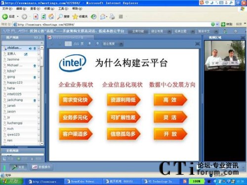2011年3月25日,intel攜手V2威速租用型視頻會議,針對構建云計算平臺,展開了一場主題為“找到云的“高低”——開放架構支撐高靈活、低成本的云平臺”別開生面的線上研討會。在此之前,V2威速租用型視頻會議曾多次攜手intel、EMC、APC、SAP等成功開展線上研討會;顒拥某晒εe辦為intel提供了一個良好的與客戶交流溝通的平臺。