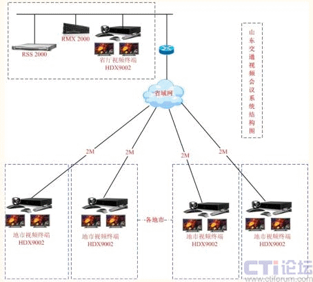 山東省交通廳高清視頻會(huì)議系統(tǒng)架構(gòu)在一個(gè)完善的、高性能的TCP/IP網(wǎng)絡(luò)基礎(chǔ)之上,基于交通廳全新開通的2M專線光纖網(wǎng)絡(luò),以省交通廳為主會(huì)場(chǎng),全省各地市交通局(委)為分會(huì)場(chǎng),共18個(gè)會(huì)場(chǎng)。