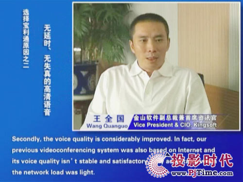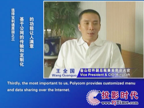 金山軟件副總裁兼首席資訊官王全國(guó)先生說(shuō)道:“對(duì)于軟件行業(yè)來(lái)說(shuō),及時(shí)、高效的溝通是保持競(jìng)爭(zhēng)優(yōu)勢(shì)的重要前提。相比之前使用的標(biāo)清產(chǎn)品,寶利通高清視頻會(huì)議系統(tǒng),提供了完全不同的體驗(yàn),流暢的高清晰畫(huà)面猶如真實(shí)的面對(duì)面溝通。而且我們公司并沒(méi)有申請(qǐng)專(zhuān)線(xiàn),所有的應(yīng)用都是基于公網(wǎng)實(shí)現(xiàn)的。另一方面,新型全中文定制菜單的運(yùn)用,令我們使用起來(lái)非常方便,這更提高了我們使用視頻通信手段實(shí)現(xiàn)異地溝通的熱情。”