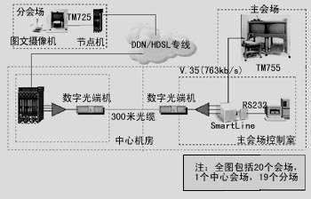 整個網絡采用輻射型星型網絡結構,共有21個網點。省公安廳為主控匯接點,對上連接公安部,對下可以管理控制多達20個市地級公安機關,組成全省公安機關會議電視系統。公安部與省公安廳之間則利用衛(wèi)星通信信道傳輸,省公安廳至各市地級公安局采用768kbps的DDN信道傳輸。省廳端DDN節(jié)點機提供10個合路2Mbps 的E1接口,加開光端機,經由300米光纜傳輸至省公安廳電視會議控制室。