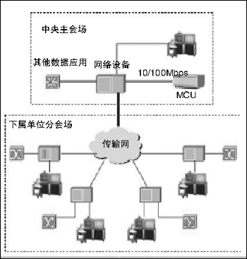 各節(jié)點的接入采用一條512Kbps帶寬的DDN/E1線路接入本地電信公司;在總部采用集中式接入中央電信公司,接入中心的電路帶寬應(yīng)該是多條信道捆綁的帶寬,中心節(jié)點交換機采用10/100Mbps與MCU相連,總部主會場的視頻終端通過接入交換機與MCU進行通信。