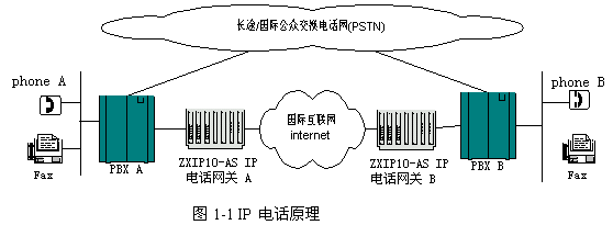 普通電話的基本流程是:用戶在phone A要打長途電話到phone B,語音從phone A到PBX A,通過PSTN網(wǎng),經(jīng)PBX B到phone B。而IP電話的基本流程為:用戶在phone A要打長途電話到phone B,語音經(jīng)PBX A傳到網(wǎng)關(guān)A。在網(wǎng)關(guān)A對語音進行處理,打成可在IP網(wǎng)絡(luò)傳輸?shù)恼Z音包。由IP網(wǎng)絡(luò)將語音包傳給網(wǎng)關(guān)B,網(wǎng)關(guān)B對語音包進行處理,還原為語音,經(jīng)PBX B傳到phone B。IP 電話原理見圖1-1。