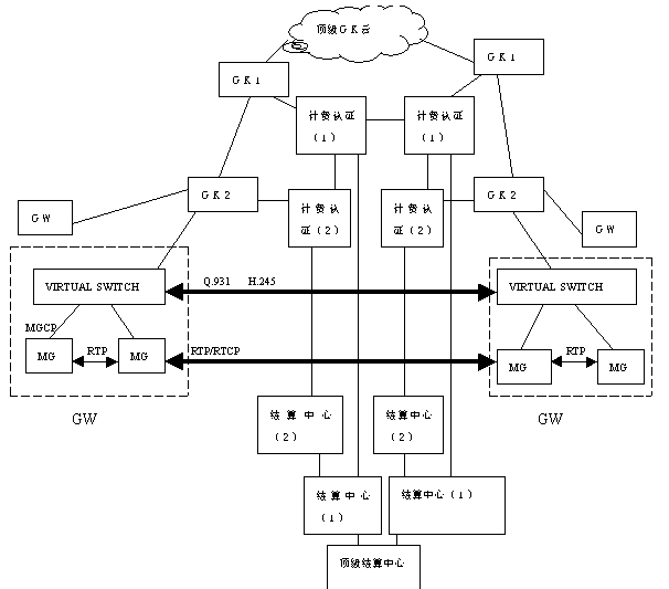 其中頂級網(wǎng)守云可以包含多個頂級網(wǎng)守,頂級網(wǎng)守之間的連接、一級網(wǎng)守與頂級網(wǎng)守之間的連接以及不同運營者之間的連接由各運營者根據(jù)各自的情況自行確定其具體的連接方式。當(dāng)IP電話運營者的網(wǎng)絡(luò)規(guī)模不是很大時,頂級網(wǎng)守的功能可由其中一個一級網(wǎng)守完成。