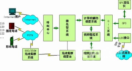 本系統(tǒng)實現(xiàn)接警、處警功能。接警中心統(tǒng)一接聽和處理市民的報警、求助電話,市民可以通過電話撥打110、119、120、122等緊急特服號碼或只撥打統(tǒng)一的特服號碼(或通過Internet方式)向系統(tǒng)求助;處警中心接收接警中心轉(zhuǎn)發(fā)的警情數(shù)據(jù),并借助地理信息系統(tǒng)的定位、空間分析功能,對所有的資源和警力通過一體化的數(shù)據(jù)傳輸和通訊調(diào)度臺進行方便的統(tǒng)一管理、指揮和調(diào)度。