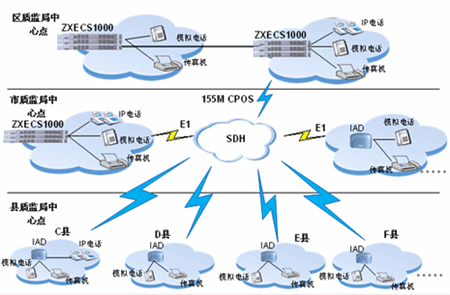 其它各接入節(jié)點(diǎn)采用IAD設(shè)備接入到ZXECS 1000,最大程度的降低了語音接入的成本,同時IAD靈活的擴(kuò)展性利于今后的升級。