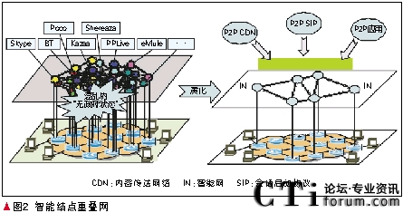 智能節(jié)點重疊網(wǎng)是覆蓋在IP核心網(wǎng)上的傳統(tǒng)的彈性重疊網(wǎng)(RON)技術(shù)與分布式哈希表(DHT)技術(shù)相結(jié)合的新型重疊網(wǎng)技術(shù),包括自動組網(wǎng)、網(wǎng)絡(luò)資源管理、路由優(yōu)化等關(guān)鍵技術(shù)。其基本結(jié)構(gòu)是保持TCP/IP協(xié)議不變,原來的3層變成3-層,在其上建立一個智能結(jié)點重疊網(wǎng)做為3+層,在此分布式管理平臺上提供流量監(jiān)控、流量控制、QoS、病毒防止和安全性等服務(wù)。智能結(jié)點重疊網(wǎng)的另外一個任務(wù)是為各種P2P應(yīng)用提供支撐環(huán)境。它可以為在互聯(lián)網(wǎng)上采用不同協(xié)議和軟件的各種P2P業(yè)務(wù),提供統(tǒng)一的支撐環(huán)境。主要是提供P2P CDN和P2P SIP。智能結(jié)點重疊網(wǎng)如圖2所示。