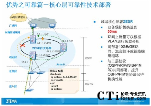 核心交換機(jī)主要是匯聚下行的全千兆智能路由交換機(jī),所以要求設(shè)備提供高密度板卡和線速轉(zhuǎn)發(fā)的能力。同時保證對下行端口進(jìn)行帶寬控制,中興采用萬兆路由交換機(jī)ZXR10 8905來滿足用戶的需求。ZXR10 8900系列萬兆路由交換機(jī)是中興通訊推出的新一代的大容量核心/匯聚路由交換機(jī)系列產(chǎn)品,主要定位于運(yùn)營商IP城域網(wǎng)、校園網(wǎng)、電子政務(wù)網(wǎng)和大型企事業(yè)網(wǎng)等網(wǎng)絡(luò)的核心/匯聚層。ZXR10 8900系列萬兆路由交換機(jī)基于先進(jìn)的模塊化理念進(jìn)行設(shè)計(jì),并采用了基于多處理器并行處理機(jī)制和Crossbar空分交換結(jié)構(gòu)的體系結(jié)構(gòu),關(guān)鍵模塊均采用可以1:1進(jìn)行冗余備份。ZXR10 8900系列具備10GE、GE、FE等各種豐富的接口模塊,并全面支持IPv4、IPv6、組播、QOS、帶寬控制等業(yè)務(wù)功能。ZXR10 8900系列整個系統(tǒng)所具備的高可靠性、高擴(kuò)展性、良好的業(yè)務(wù)能力等特點(diǎn),可以滿足各種網(wǎng)絡(luò)核心/匯聚層的建設(shè)需求。