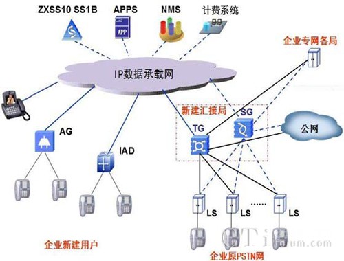 在A城市大企業(yè)總部,將原有的端局通過E1接口連接到TG/SG,在軟交換控制設(shè)備的控制下,實(shí)現(xiàn)企業(yè)原有電話和企業(yè)內(nèi)部跨域的各分支之間的VoIP語音長(zhǎng)途業(yè)務(wù)。同時(shí)通過在TG進(jìn)行路由配置,實(shí)現(xiàn)了企業(yè)軟交換網(wǎng)絡(luò)各IP語音終端與A城市PSTN的互通,實(shí)現(xiàn)企業(yè)各地到A城市PSTN網(wǎng)的來話落地。