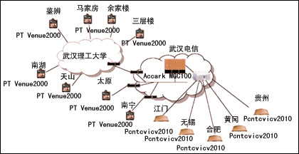 武漢理工大學(xué)的遠(yuǎn)程教學(xué)系統(tǒng)由于分2期建設(shè),網(wǎng)絡(luò)條件較為復(fù)雜。一期主要以PT的Venue2000終端+Accord MGC100 MCU為主,是H.323系統(tǒng);二期采用Penteview2010終端+Penteview6088MCU,是H.320系統(tǒng),此案例是國內(nèi)首家教育行業(yè)H.320與H.323混合組網(wǎng)方式的視頻電視遠(yuǎn)程教學(xué)網(wǎng)。各教室均采用了中太數(shù)據(jù)的遠(yuǎn)程教學(xué)中控系統(tǒng),整個組網(wǎng)采用星型結(jié)構(gòu),2010和6088之間采用512k的DDN專線連接,其中,384k用于傳輸視頻、音頻,128k用于傳輸T.120數(shù)據(jù)。2010設(shè)備及其標(biāo)準(zhǔn)外設(shè),加上符合遠(yuǎn)程教育功能需要的其他外設(shè),構(gòu)成遠(yuǎn)程教育網(wǎng)絡(luò)專用教室的設(shè)備配置。