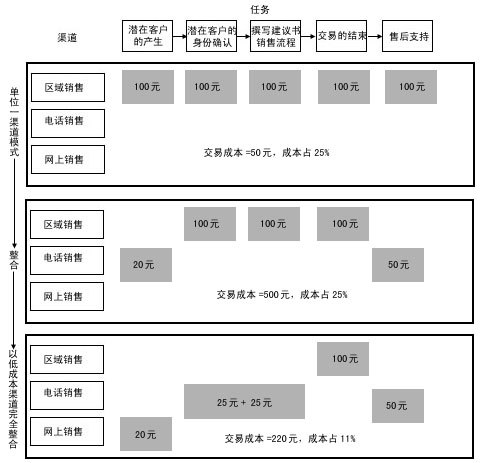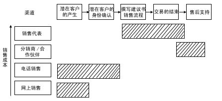 渠道整合強(qiáng)調(diào)在一個銷售過程中分工的不同給企業(yè)帶來更多的利潤,將銷售過程的任務(wù)一一分配給不同成本的渠道來完成。銷售過程的中間環(huán)節(jié)——面對面的銷售和交易的達(dá)成,通常需要由成本較高的區(qū)域銷售代表和分銷伙伴來完成,客戶的產(chǎn)生及身份的確認(rèn)和售后服務(wù)環(huán)節(jié)通常由低成本渠道完成,F(xiàn)在,我們對照圖4來比較一下: