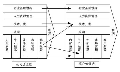企業(yè)的主要活動都是具有相應價值的,這些活動構(gòu)成了企業(yè)的價值鏈,企業(yè)價值鏈首先表現(xiàn)為企業(yè)內(nèi)部的聯(lián)系和支撐,各種活動相互配合,才能產(chǎn)生價值和利潤;其次,企業(yè)的活動和上游供貨商和下游用戶緊密聯(lián)系,相互影響。顯然,供貨商、用戶的各種活動方式能夠直接或者間接地影響企業(yè)的成本、利潤和競爭優(yōu)勢,同樣,企業(yè)的各種活動也將對它們產(chǎn)生很大的影響。