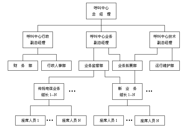上圖是我們建議的呼叫中心組織結(jié)構(gòu)圖,其中業(yè)務(wù)監(jiān)督部門、業(yè)務(wù)拓展部門和運(yùn)行維護(hù)部門是呼叫中心最關(guān)鍵的部門,財(cái)務(wù)部和行政人事部是三大核心部門的支撐部門。