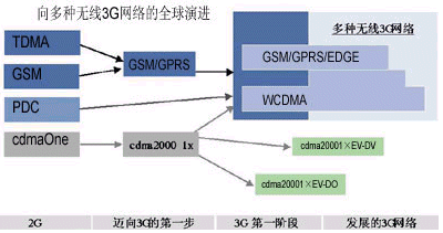 移動(dòng)多媒體服務(wù)需要網(wǎng)絡(luò)具有更高的速度和更大的容量。蘇敏芬詳細(xì)描述了網(wǎng)絡(luò)由2G向3G演進(jìn)的過程(如圖1)。據(jù)介紹,2G的技術(shù)基于多種標(biāo)準(zhǔn),包括TDMA、GSM、PDC和cdmaOne。其中,TDMA是美國(guó)采用最廣泛的2G技術(shù),但現(xiàn)在,美國(guó)的運(yùn)營(yíng)商已經(jīng)越來越多地開始采用GSMc以及GPRS、EDGE等基于GSM的技術(shù);GSM存在于全球70%的運(yùn)營(yíng)商網(wǎng)絡(luò),這種全球化技術(shù)不僅能夠給最終用戶提供服務(wù)、漫游以及通信質(zhì)量方面的很多好處,它還可以節(jié)省運(yùn)營(yíng)商的投資,在從GSM向WCDMA演進(jìn)的過程中,也會(huì)為運(yùn)營(yíng)商帶來諸多裨益。PDC是在日本被廣泛采用的一種技術(shù)標(biāo)準(zhǔn),但現(xiàn)在,WCDMA技術(shù)也正在逐漸被日本運(yùn)營(yíng)商采用。cdmaOne(即IS-95)在韓國(guó)得到了比較多的應(yīng)用,韓國(guó)的運(yùn)營(yíng)商面臨兩條發(fā)展道路,即從cdmaOne向WCDMA發(fā)展或向CDMA2000發(fā)展。中國(guó)主要采用GSM技術(shù),但也有小部分網(wǎng)絡(luò)采用了cdmaOne技術(shù)。