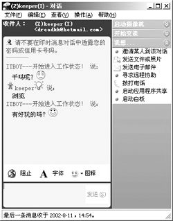 聊天功能是IM軟件最基本、也是最重要的功能,基本上每一種IM軟件在這個(gè)功能上的操作都差不多:如果用戶想與聯(lián)系人進(jìn)行聊天,可以雙擊IM中聯(lián)系人的頭像,在彈出的對話框中敲入文字信息發(fā)送即可。QQ的特點(diǎn)是可以給不在線的朋友發(fā)送信息,對方下次上線的時(shí)候可以收到,MSN雖然不具備這樣的功能,但是它在聊天過程中可以使用各種漂亮的表情圖標(biāo)為聊天添加了不少情趣。