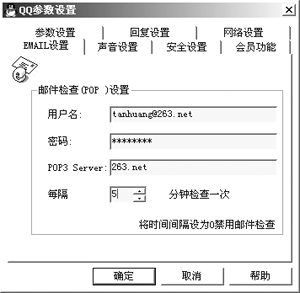 IM和E-mail是我們在網(wǎng)上最常用的兩種工具,如今不少IM軟件將兩者作了完美的結(jié)合。在QQ中你可以直接給自己的好友發(fā)郵件,而無須再輸入E-mail地址;此外對于自己的信箱QQ還有檢查新郵件功能,在“系統(tǒng)參數(shù)”中設(shè)置您自己的E-mail,填好POP3地址,您可以選擇定時(shí)檢查時(shí)間,QQ就會自動(dòng)檢查有否新郵件到達(dá)。對于MSN