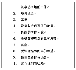 10. 來自公司高層的認(rèn)可。這是一個非常有效的作法,能得到公司高層的認(rèn)可對很多人來說,是一生都可以值得回憶的事情。如果在一家全球的大公司,和公司CEO共同進(jìn)餐,得到公司CEO的親筆信,和CEO合影等都是非常高的榮譽(yù)。當(dāng)然,這個作法不是可以經(jīng)常用的。因?yàn)椋绻玫锰?jīng)常了,就可以失去了一種"神秘感"或"來之不易"的感覺。