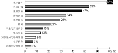 到底有多少人需要移動數(shù)據(jù)業(yè)務呢?有資料顯示,當前有36%的人對移動數(shù)據(jù)業(yè)務處于觀望狀態(tài),只要移動數(shù)據(jù)業(yè)務發(fā)展得好,他們肯定會加入進來。我們相信,現(xiàn)在已經(jīng)有一定比例的人開始從觀望狀態(tài)加入使用移動數(shù)據(jù)業(yè)務的行列中來。如圖2所示,在用戶需求中,電子郵件占67%,娛樂性的業(yè)務也占有較高的比例,新聞、信息類其次。這些數(shù)據(jù)說明,人們使用移動數(shù)據(jù)業(yè)務,大部分的習慣是沿襲互聯(lián)網(wǎng)的,這也為移動網(wǎng)絡與互聯(lián)網(wǎng)的結(jié)合奠定了用戶基礎。
