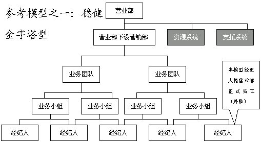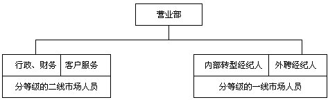 此五種模式建立在營業(yè)部基礎上,在券商總部,建議設立垂直的業(yè)務管理機構(gòu),即經(jīng)紀業(yè)務總部實行事業(yè)部制,下設分工專業(yè)的市場營銷部、客戶服務部、經(jīng)紀人訓練部和綜合管理部等。