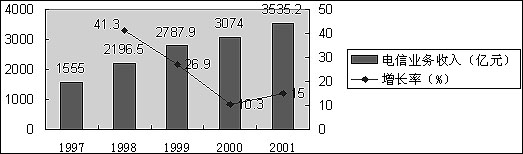 過(guò)去幾年是我國(guó)電信業(yè)大發(fā)展時(shí)期,電信收入平均每年增長(zhǎng)約23%。電話用戶總數(shù)與移動(dòng)電話總數(shù)迅速增長(zhǎng),并在2001年超過(guò)美國(guó),躍居世界第一。但是,過(guò)去的高增長(zhǎng)并不必然帶來(lái)明天的高增長(zhǎng),在2000年和2001年,我國(guó)電信收入已經(jīng)呈現(xiàn)出稍高于GDP的中速增長(zhǎng)態(tài)勢(shì)。