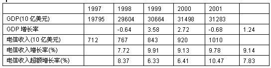 盡管電信運(yùn)營(yíng)業(yè)存在投資過(guò)度,并導(dǎo)致巨額虧損,但是過(guò)去幾年世界電信收入的增長(zhǎng)率高于GDP,平均為7.8 3%,顯示出電信運(yùn)營(yíng)業(yè)仍呈現(xiàn)出強(qiáng)勢(shì)發(fā)展特征。表中的數(shù)據(jù)表明:電信業(yè)仍是經(jīng)濟(jì)中最具增長(zhǎng)力量的部分。