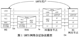 對圖1的簡要描述如下:移動用戶(MS)到RAN左側(cè)部分是無線接入網(wǎng)絡(luò)的無線用戶接口(Uu),實(shí)現(xiàn)了用戶業(yè)務(wù)通過空中無線鏈路接入3G網(wǎng)絡(luò)的功能,主要包含物理層(采用WCDMA和TD-CDMA技術(shù))、媒體接入層(MAC)、無線鏈路層(RLC);在RAN內(nèi)部通過協(xié)議中繼(Relay)實(shí)現(xiàn)無線鏈路和有線鏈路的對接;在RAN和3G服務(wù)節(jié)點(diǎn)之間的接口(Iu)是以ATM技術(shù)為支撐的有線接入段協(xié)議,為支持Internet業(yè)務(wù),采用AAL5適配層協(xié)議,物理層(L1)無明確限定具體傳輸方式;在此之上,透過RAN、MS和3G服務(wù)節(jié)點(diǎn)之間存在兩個高層連接,即邏輯聯(lián)絡(luò)層(LLC)和更為復(fù)雜的第三層實(shí)體(L3CE),L3CE是一些以Client/Server方式構(gòu)件的軟件實(shí)體,實(shí)現(xiàn)諸如無線資源管理、呼叫控制、移動管理等網(wǎng)絡(luò)級功能;在3G服務(wù)節(jié)點(diǎn)內(nèi)部,為實(shí)現(xiàn)到Internet網(wǎng)絡(luò)的接入,再作一次協(xié)議中繼,這里,第三層實(shí)體的信息映射到通用分組無線服務(wù)的隧道協(xié)議GTP(GPRS Tunneling Protocol);3G服務(wù)訪問點(diǎn)到3G網(wǎng)關(guān)之間的Gn接口存在清晰的、以TCP/IP協(xié)議為主體的五層對應(yīng)關(guān)系;構(gòu)建在最上層的是移動用戶到3G網(wǎng)關(guān)的UMTS用戶進(jìn)程,它通過3G網(wǎng)關(guān)進(jìn)入Internet骨干網(wǎng),最終實(shí)現(xiàn)用戶對Internet的訪問。