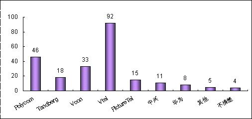 各品牌的認(rèn)知度與其市場(chǎng)銷售情況息息相關(guān)。例如,VTEL是最早進(jìn)入中國(guó)市場(chǎng)的視頻會(huì)議廠商,并在相當(dāng)長(zhǎng)的時(shí)期內(nèi)占據(jù)市場(chǎng)領(lǐng)先地位,取得顯著的品牌認(rèn)知度是有其廣泛用戶基礎(chǔ)作為支撐的;POLYCOM雖然從1998年才開始進(jìn)軍中國(guó)市場(chǎng),但在基于IP的視頻會(huì)議系統(tǒng)的市場(chǎng)爭(zhēng)奪中取得較好的成績(jī);PictureTel已經(jīng)被POLYCOM收購(gòu),品牌認(rèn)知度也相對(duì)較低;而國(guó)內(nèi)品牌中興、華為剛剛起步,也很難達(dá)到較高的認(rèn)知度。