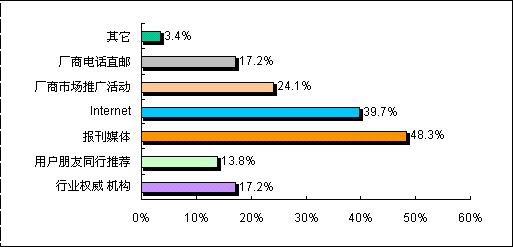 此次調(diào)查顯示,由于視頻會(huì)議系統(tǒng)的行業(yè)性相對(duì)較強(qiáng),目前用戶在了解視頻終端會(huì)議系統(tǒng)產(chǎn)品時(shí),報(bào)刊媒體、Internet、廠商推廣活動(dòng)、廠商電話直郵和行業(yè)權(quán)威機(jī)構(gòu)成為主要的信息來源渠道。值得注意的是網(wǎng)絡(luò)的普及使得更多的用戶也選擇Internet作為了解信息的重要途徑。但對(duì)各視頻會(huì)議系統(tǒng)的廠商而言,由于客戶群體相對(duì)龐大,分散區(qū)域較為廣泛,在作好直銷的同時(shí),也應(yīng)該加強(qiáng)渠道的建設(shè),以更及時(shí)和準(zhǔn)確地了解到用戶采購(gòu)和招標(biāo)的信息,同時(shí)也能夠降低銷售成本。