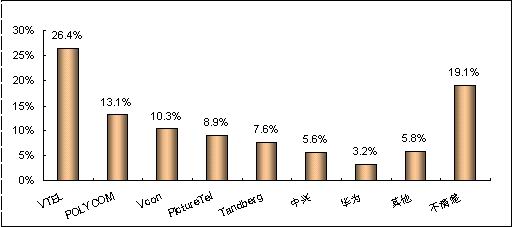 在無提示情況下,被調(diào)查者首先想到的視頻會(huì)議終端系統(tǒng)的品牌分布情況,即品牌第一提及率指標(biāo),可以反映出各品牌被用戶認(rèn)知的廣泛程度。賽迪顧問調(diào)查數(shù)據(jù)顯示,第一提及率最高的品牌是VTEL,支持率達(dá)到26.4%,比處于第二位的品牌高出13.3個(gè)百分點(diǎn);其次是POLYCOM和Vcon,支持率達(dá)到13.1%和10.3%。(見圖5)