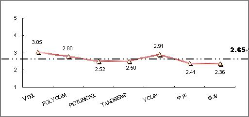 為深入了解和對(duì)比被調(diào)查者對(duì)不同品牌視頻會(huì)議終端系統(tǒng)產(chǎn)品的認(rèn)知程度,本次調(diào)查將被調(diào)查者對(duì)各主要品牌的了解程度劃分為五個(gè)檔次,對(duì)不同的檔次賦予不同的分值,分別為“非常了解(5分)”、“了解(4分)”、“一般(3分)”、“不了解(2分)”、 “非常不了解(0分)”,同時(shí)綜合考慮以購(gòu)買用戶擁有的品牌分布,借以比較不同品牌在認(rèn)知度上的差異。統(tǒng)計(jì)結(jié)果顯示,目前在中國(guó)市場(chǎng)上,用戶對(duì)主要視頻會(huì)議終端系統(tǒng)產(chǎn)品品牌的了解程度的平均值為2.65,各品牌認(rèn)知度分值見圖6。其中:VTEL品牌的知名度最高,指標(biāo)值為3.05,超過了“一般”了解水平;其次為VCON品牌,指標(biāo)值為2.91;POLYCOM的知名度指標(biāo)值為2.8,處于第三位。除VTEL品牌外,其他主要品牌的知名度還都處于低于“一般”了解水平階段,反映出產(chǎn)品的市場(chǎng)認(rèn)知還較低。