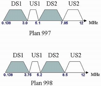 此標準從中國的實際情況出發(fā),既適應接入網(wǎng)絡總體流量的非對稱特性,又考慮滿足一些對上行速率要求較高、接近對稱的業(yè)務需求;既考慮當前技術和設備狀況,又兼顧未來技術發(fā)展和一段時期內(nèi)可能的業(yè)務需求,提出了中國的VDSL頻段劃分方式。這種方式在Plan998