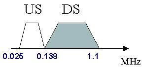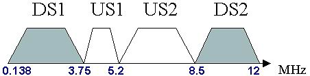 VDSL使用的頻譜較寬,最高可達12 MHz 。這一頻譜范圍可被分割為若干下行(DS)和上行(US)頻段,國際上常用的頻段劃分方式(Band