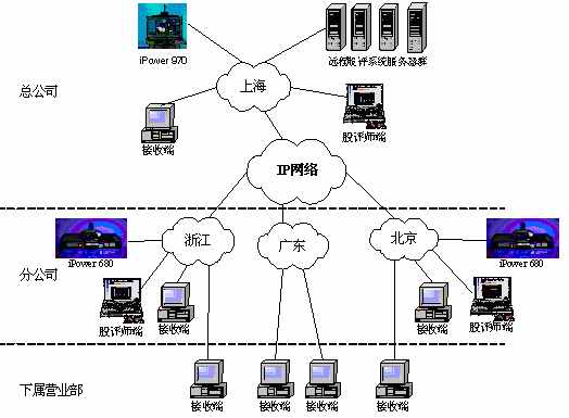 某證券公司有三級網(wǎng)絡(luò),總公司、分公司和下屬營業(yè)部?偣镜椒止編捠2M,在總公司配置一套會議室型電視會議終端POLYCOM 970和一套多點會議服務(wù)器Radvision ViaIP400。在分公司配置了38套會議室型電視會議終端POLYCOM 680,用于與總公司進行雙向視頻會議。分公司到營業(yè)部帶寬是512K,各營業(yè)部安裝遠程股評系統(tǒng)接收端程序,遠程股評系統(tǒng)服務(wù)器都放置在海通總公司。當(dāng)在總公司進行股評時,總公司本地攝像頭拍攝教師畫面,MIC采集教師聲音,傳給服務(wù)器編碼,再通過網(wǎng)絡(luò)供各個接收端接收;當(dāng)在分公司進行股評時,首先分公司的電視會議設(shè)備采集教師畫面及聲音傳回總公司的電視會議設(shè)備,再傳給遠程股評系統(tǒng)的服務(wù)器進行編碼,然后通過網(wǎng)絡(luò)發(fā)布,供接收端接收。(結(jié)構(gòu)如下圖)