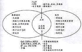 NGN是融合網(wǎng)絡。數(shù)據(jù)網(wǎng)與電信網(wǎng)曾是兩個有著不同特性的網(wǎng)絡,它們的融合將帶來一系列新的業(yè)務,并對網(wǎng)絡平臺提出新的要求(見圖1)。因此,NGN的網(wǎng)絡功能結(jié)構(gòu)如何設定是我們要關注的重點。