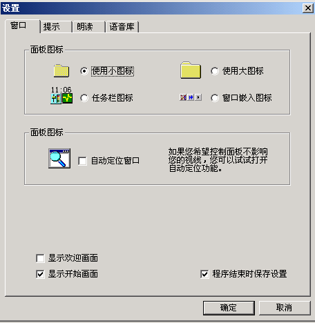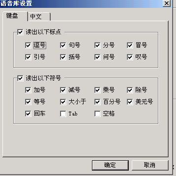 如果需要進(jìn)一步的調(diào)整,可以選擇菜單里的“設(shè)置……”。打開設(shè)置窗口(如圖3)。窗口共分四個選項,每個選項里除了剛介紹的幾種常用功能調(diào)整外,還可以控制歡迎畫面、開始畫面、設(shè)定存儲等功能,規(guī)定提示速度、朗讀速度的快慢,選擇提示方式,設(shè)定提示報警條件。在“語音庫”選項中還可以選擇朗讀為男聲還是女聲。單擊“設(shè)置”按鈕,可以根據(jù)具體需要選擇“鍵盤”或“中文”里被朗讀標(biāo)點(diǎn)符號的種類(如圖4)。