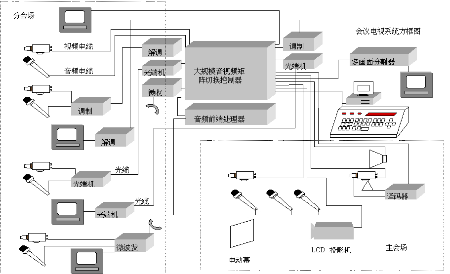 會(huì)議主機(jī)實(shí)現(xiàn)分會(huì)場和主會(huì)場的電視信號的交互切換,將各個(gè)分會(huì)場的電視信號送到液晶投影儀上顯示,采用液晶投影儀作大屏幕顯示在電視墻顯示方式,投資小,設(shè)有閃爍感,使主會(huì)場人員的視覺更舒適(參見系統(tǒng)圖)。