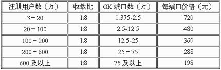 價(jià)格初期為720元/端口,后期逐年下降,每年為前期的80%。當(dāng)前GK端口價(jià)格以下表為依據(jù):