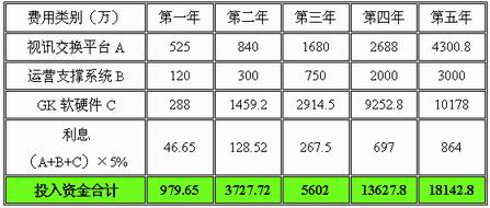 綜合上面三部分成本構(gòu)成,得出從系統(tǒng)建設(shè)并開始運(yùn)營(yíng)的頭五年中,各個(gè)年份建網(wǎng)資金投入和總投入: