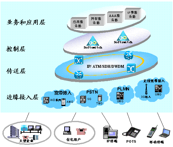 d)邊緣接入層:由各類媒體網(wǎng)關(guān)和綜合接入設(shè)備(IAD)組成,通過各種接入手段將各類用戶連接至網(wǎng)絡(luò),并將信息格式轉(zhuǎn)換成為能夠在分組網(wǎng)絡(luò)上傳遞的信息格式。