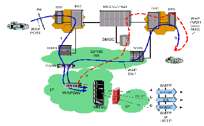 ·圖中第一條消息流顯示了多媒體消息由BTS、BSC、SGSN和GGSN到達(dá)IP網(wǎng)絡(luò),通過WAP Gateway被轉(zhuǎn)發(fā)到MMSC中。
