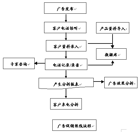 廣告熱線是在呼叫中心系統(tǒng)中設(shè)立專(zhuān)欄,為廣告中的產(chǎn)品或服務(wù)提供更詳細(xì)的資料。首先應(yīng)將需要在廣告中出現(xiàn)的詳細(xì)內(nèi)容或不適合在廣告中出現(xiàn)的內(nèi)容按照要求導(dǎo)入呼叫中心系統(tǒng),準(zhǔn)備就緒后,就在媒體或其他介質(zhì)上做廣告,其中廣告的內(nèi)容中含廣告熱線號(hào)碼。電話號(hào)碼建議采用800電話,以提高客戶撥打電話的積極性。呼叫中心會(huì)記錄打進(jìn)的每一個(gè)電話,并且提供完成的系統(tǒng)報(bào)表。這樣可以彌補(bǔ)廣告中提供給消費(fèi)者內(nèi)容不足的缺陷,另一方面可以根據(jù)電話量判斷廣告的效果。