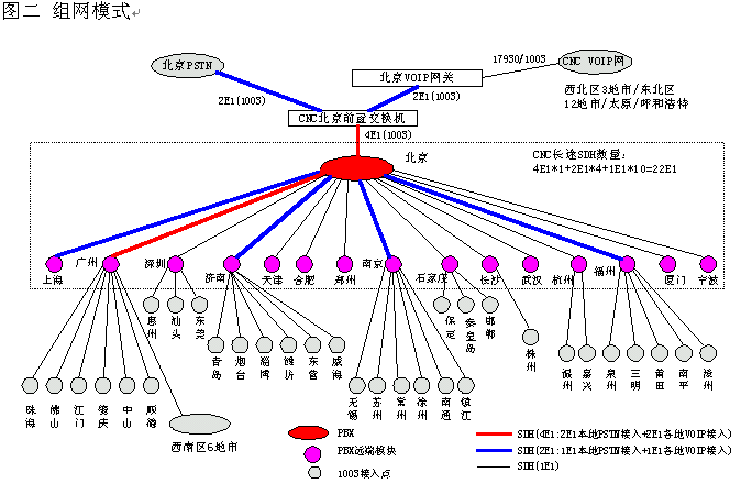 網(wǎng)通的客戶服務(wù)系統(tǒng)(1003呼叫中心)包括位于北京總部的總中心及其它全國30多個城市的分中心,全國范圍共有近200個接入點(覆蓋城市),共有200余座席,由總中心,交換機遠端模塊接入點子中心及軟覆蓋接入點組成的三層架構(gòu)。參見下圖一《系統(tǒng)架構(gòu)》及圖二《組網(wǎng)模式》。